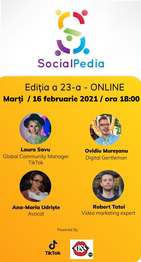 Te așteptăm pe 16 februarie, la ora 18:00, live pe ZOOM pentru o ediție despre TikTok. Abordăm TikTok atât din perspectiva brandului, cât și din perspectiva creatorilor de conținut. Apoi vorbim despre social media dintr-o perspectivă legală și aflăm ce avem voie și ce nu avem voie să facem în online.