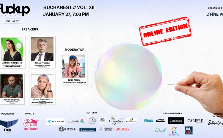 SocialPedia ianuarie 18, 2022 Parteneriate Fuckup Nights Bucharest ajunge la editia a XII-a Evenimentul are loc joi, 27 ianuarie, incepand cu ora 7 PM, pe platforma online Zoom.